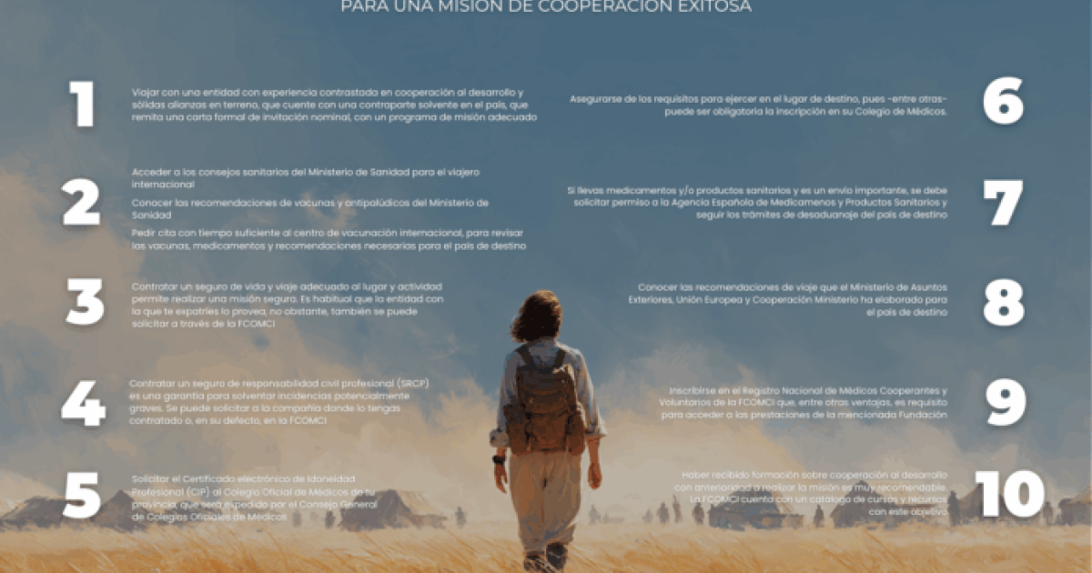La Fundación para la Cooperación Internacional de la Organización Médica Colegial (FCOMCI) pone a disposición de los profesionales sanitarios una guía práctica con 10 pasos imprescindibles para garantizar el éxito y la seguridad de una misión de cooperación. Desde la preparación del viaje y el cuidado de la salud hasta los seguros, certificados y formación previa necesarios, estos consejos ofrecen un marco completo para quienes desean colaborar en proyectos de cooperación al desarrollo de manera responsable y eficaz.