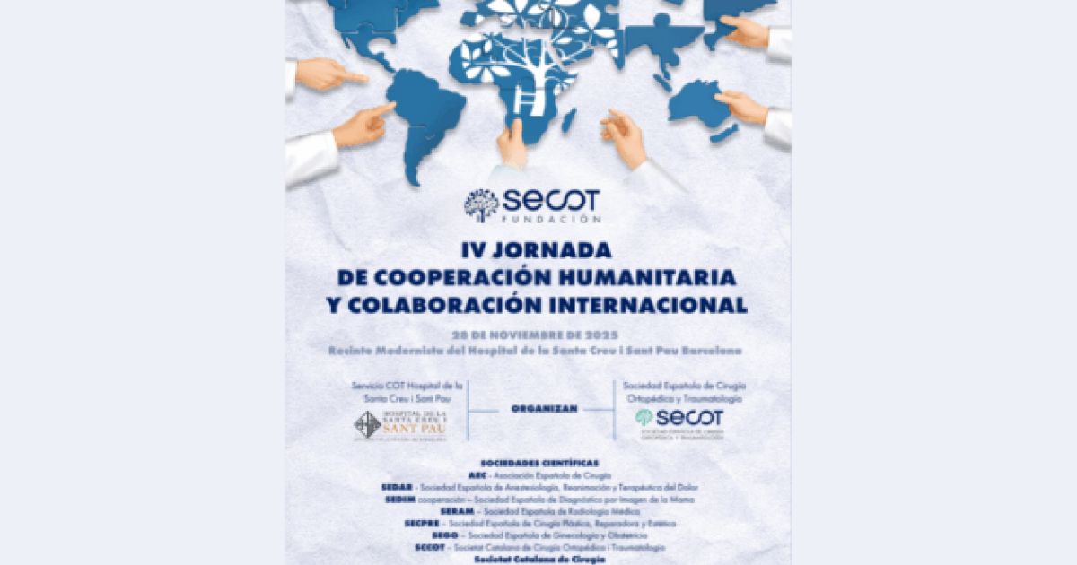 La Sociedad Española de Cirugía Ortopédica y Traumatología (SECOT), en colaboración con el Servicio de Cirugía Ortopédica y Traumatología del Hospital de la Santa Creu i Sant Pau, organizan el próximo 28 de noviembre la IV Jornada de Cooperación Humanitaria y Colaboración Internacional, un encuentro que reunirá a profesionales de distintas especialidades médicas comprometidos con la asistencia y la docencia en contextos de cooperación y ayuda humanitaria.