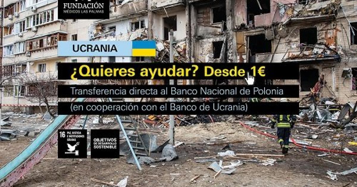 En un solo paso, se puede donar desde 1€ hasta el 25 MAR (13h.). Este dinero se ingresa en la Fundación del Colegio de Médicos de Las Palmas. Sin más intermediarios, se transferirá a la cuenta que el Banco Nacional de Ucrania (NBU) ha creado expresamente para ayudar a refugiados y su población en el Banco Nacional de Polonia (BGK).